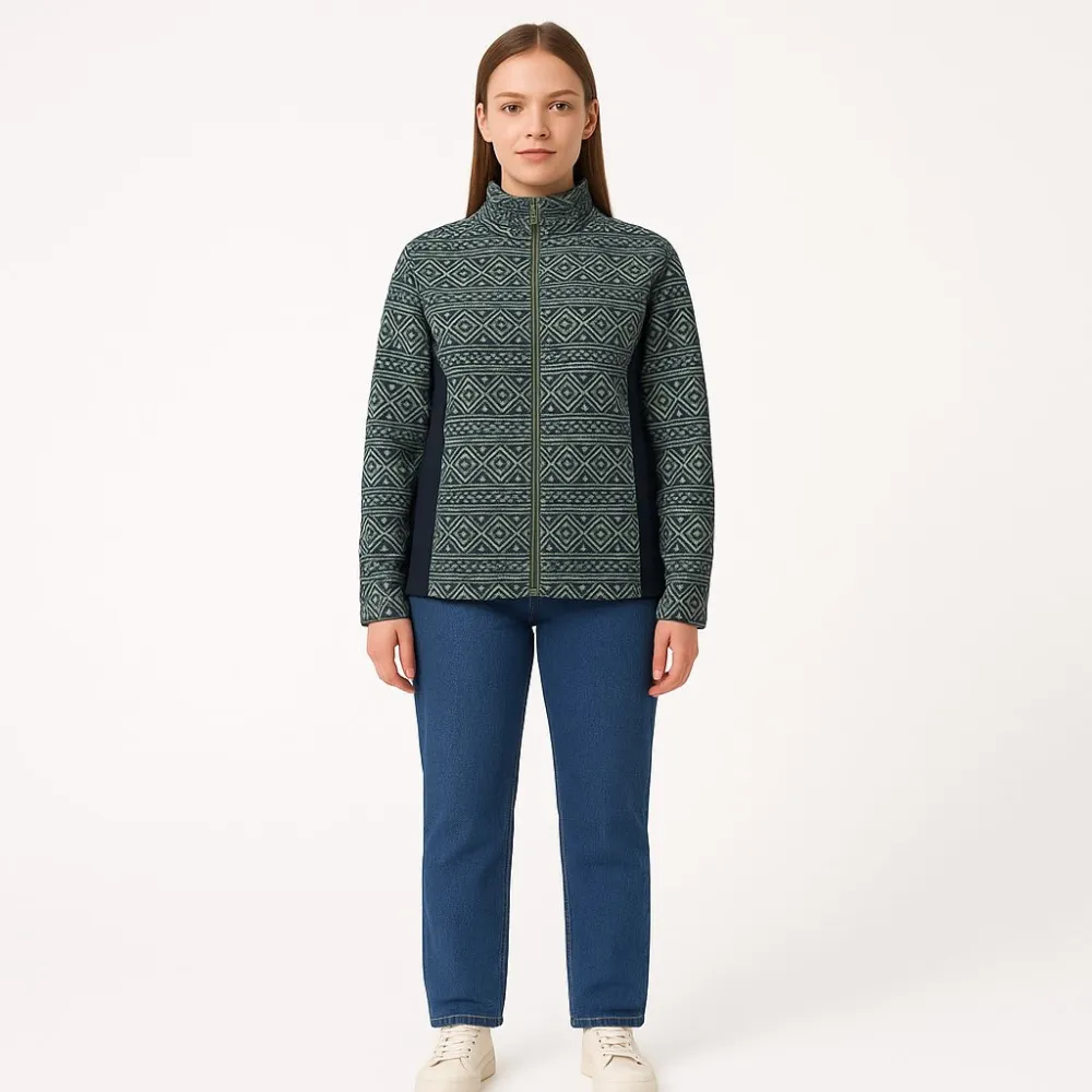Кофта Nanok из мягкого флиса с геометрическим узором и застёжкой на молнию. Подойдёт для прогулок, поездок и активного отдыха в прохладную погоду, хорошо смотрится с джинсами. Практичный плюс — лёгкая, быстро сохнет и проста в уходе.