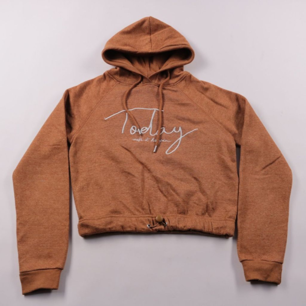 Укороченная женская толстовка Jean Pascale с капюшоном и шнурком по низу, в коричневом (карамельном) оттенке с надписью спереди. Подойдёт для повседневных образов и прогулок в прохладную погоду, удобно комбинируется с джинсами и спортивными брюками. Тё...
