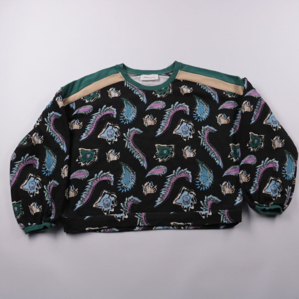 Свитшот POM Amsterdam из 100% органического хлопка с ярким принтом пейсли и зелёной отделкой по горловине и плечам. Подойдёт для повседневных образов в прохладную погоду и как акцентная вещь с однотонным низом. Практичен тем, что хлопковый футер прияте...