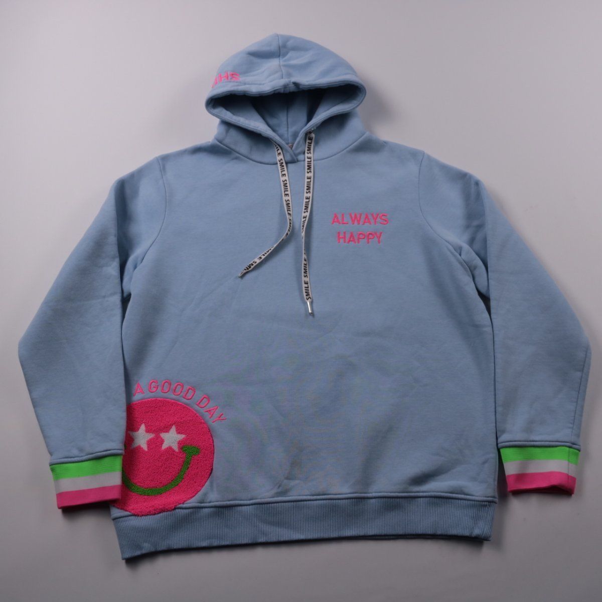 Толстовка Zwillingsherz голубого цвета с капюшоном и яркими принтами/нашивками. Подойдёт для прогулок и повседневных образов в прохладную погоду, хорошо сочетается с джинсами и спортивными брюками. Мягкий материал и капюшон делают её комфортной и практичной на каждый день.