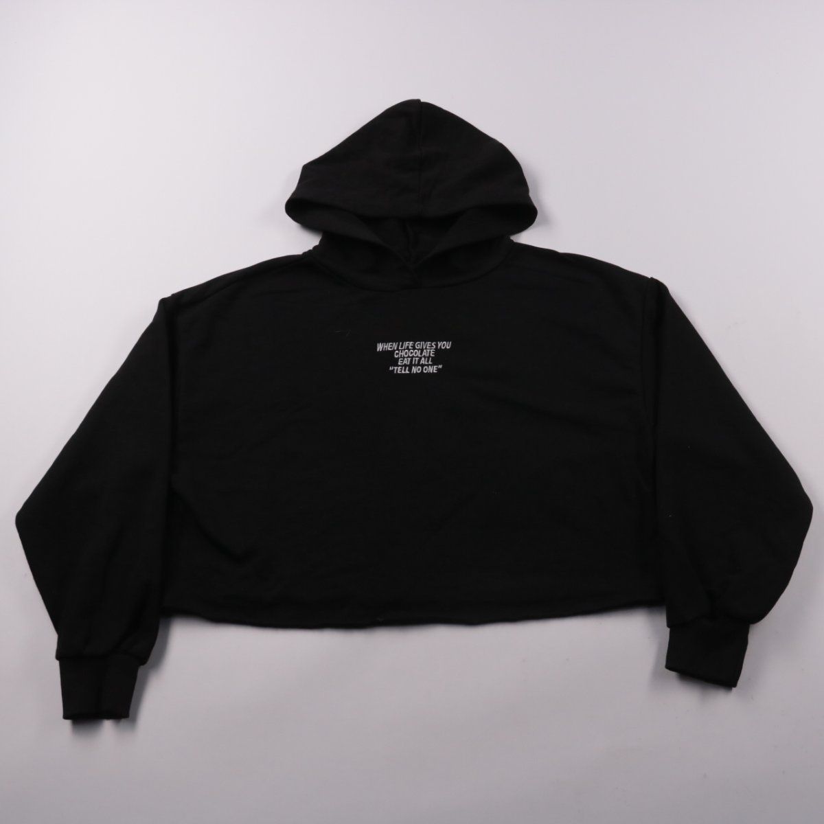 Укороченная толстовка DeFacto из мягкого трикотажа с капюшоном и небольшим текстовым принтом спереди. Подойдёт для повседневных образов с джинсами или спортивными брюками в прохладную погоду. Практичный чёрный цвет легко сочетается и не маркий.