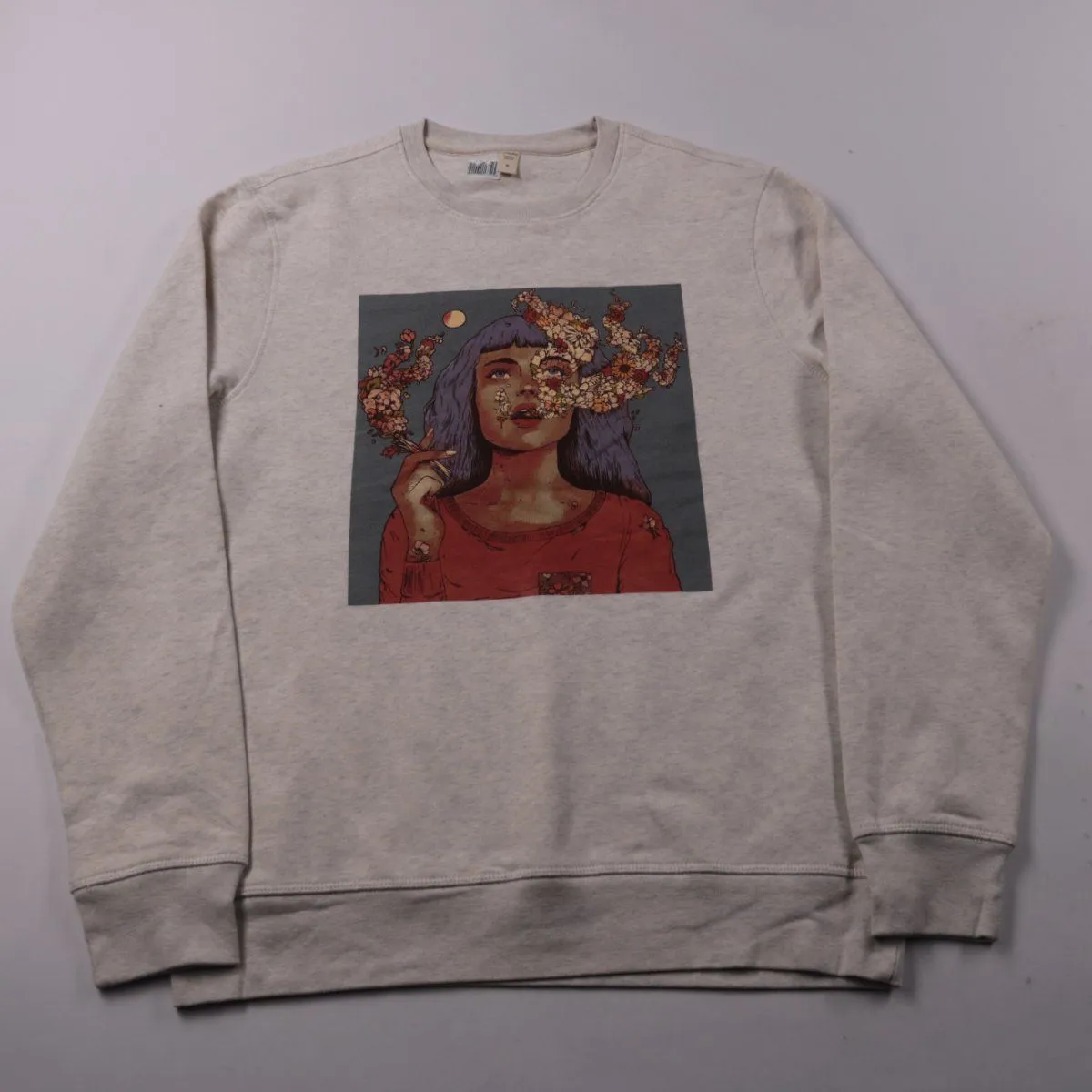 Свитшот Wituka светло-серого меланжевого цвета с крупным принтом на груди и круглым вырезом. Подойдёт для повседневных образов и как второй слой в прохладную погоду. Практичен тем, что легко сочетается с джинсами и спортивными брюками.