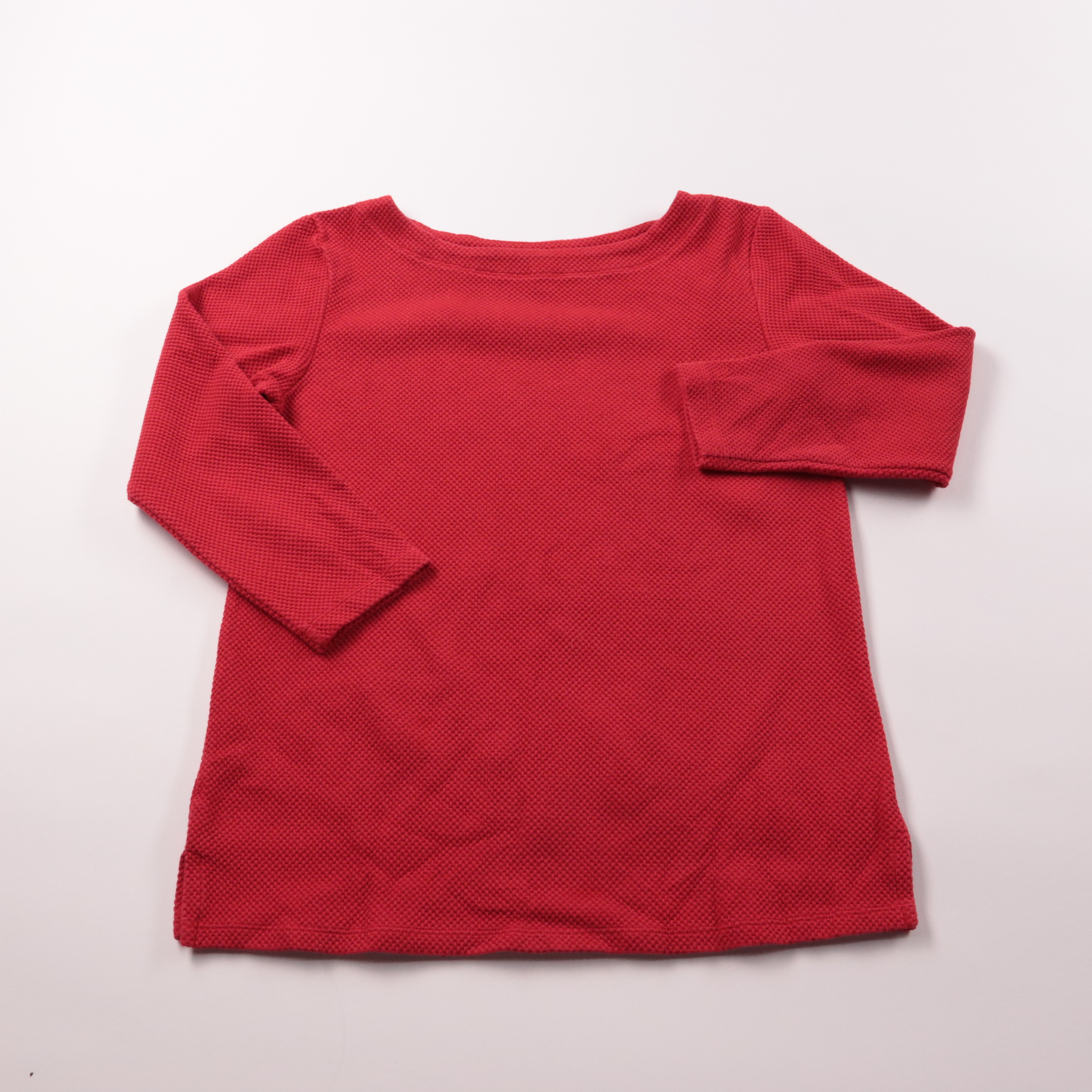 Женский лонгслив Hema красного цвета из фактурного трикотажа с вырезом «лодочка» и рукавом 3/4. Подойдёт для повседневных образов и офиса в сочетании с джинсами, брюками или юбкой. Ткань плотная и держит форму, комфортно носится в прохладную погоду.