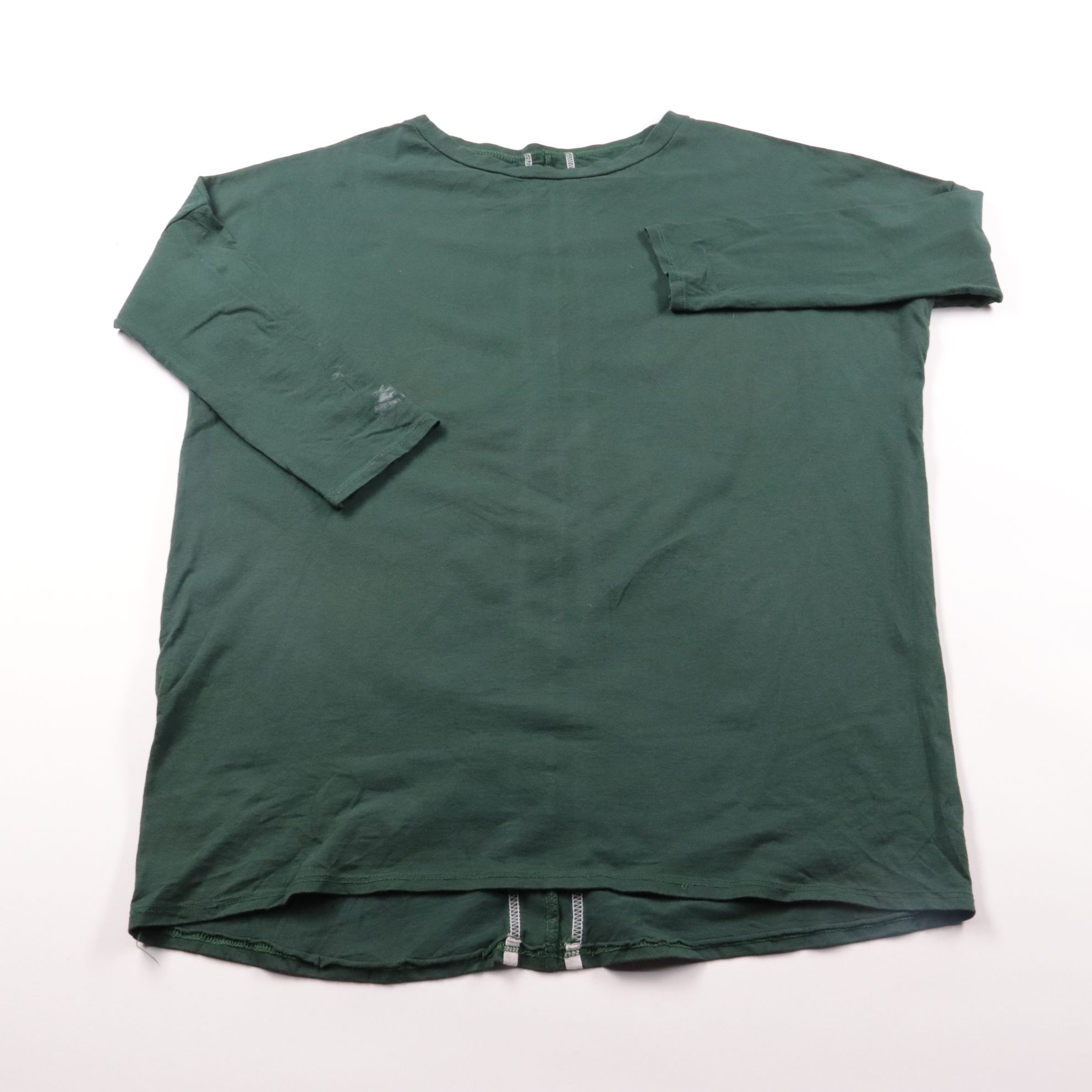Однотонный лонгслив тёмно-зелёного цвета с круглым вырезом и свободной посадкой. Подойдёт для повседневных образов и как базовый слой в прохладную погоду. Практичен тем, что легко сочетается с джинсами и брюками и не требует сложного ухода.