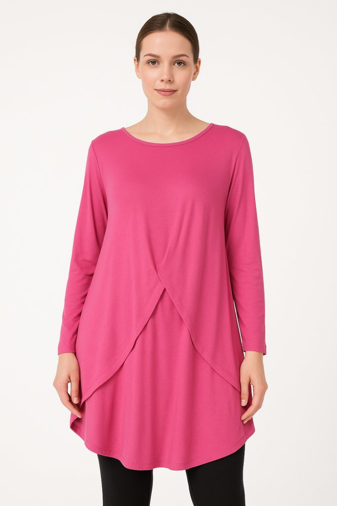 Женский лонгслив свободного кроя из полиэстера в ярком розовом цвете. Модель с длинным рукавом и асимметричным подолом, хорошо подойдёт для повседневных образов с легинсами или джинсами. Ткань лёгкая и почти не мнётся, удобно в уходе.