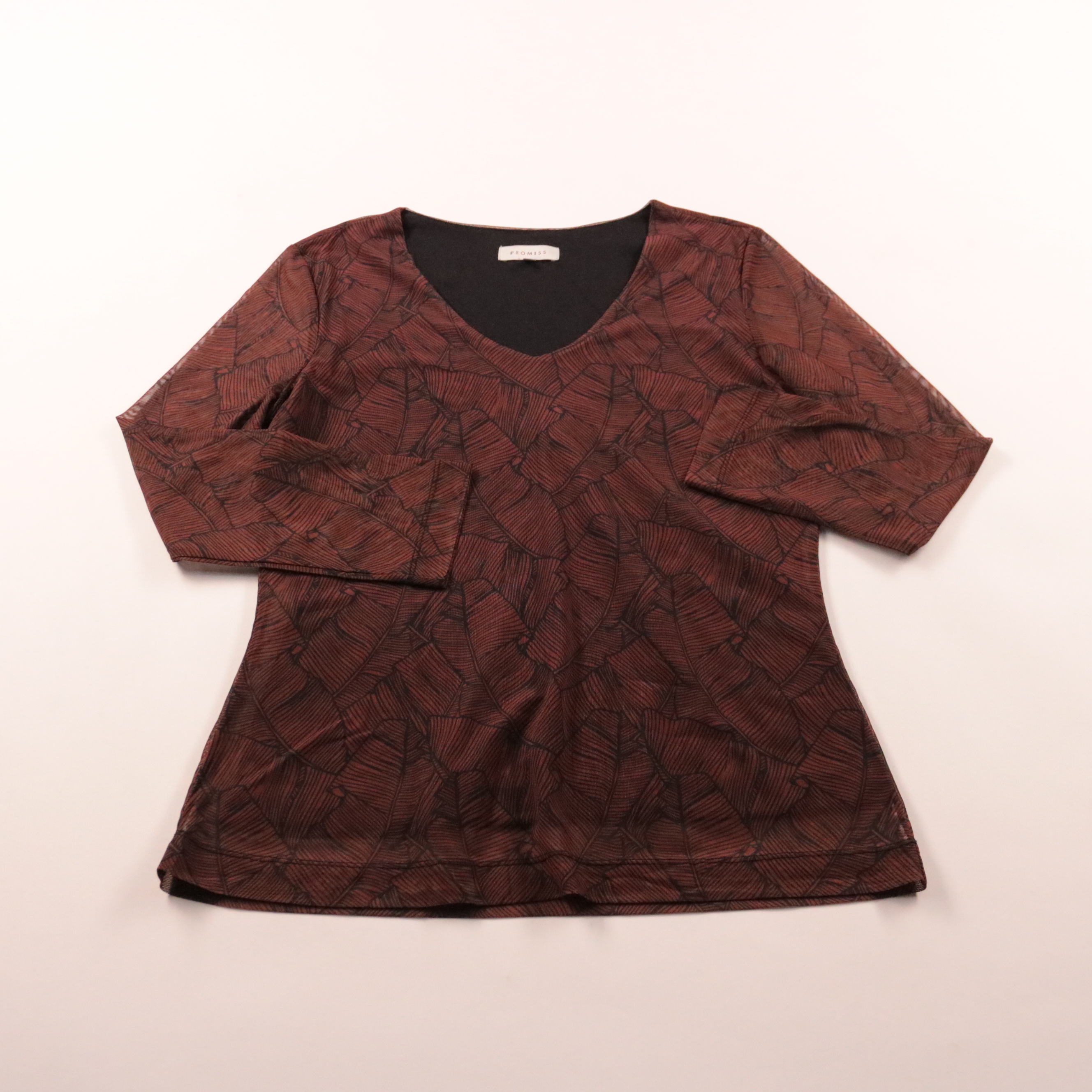 Лонгслив Promiss в бордовом цвете с черным графичным принтом и V‑образным вырезом. Подойдет для повседневных образов в демисезон, хорошо смотрится с джинсами или однотонными брюками. Практичный плюс — немаркий оттенок и удобный трикотажный материал.