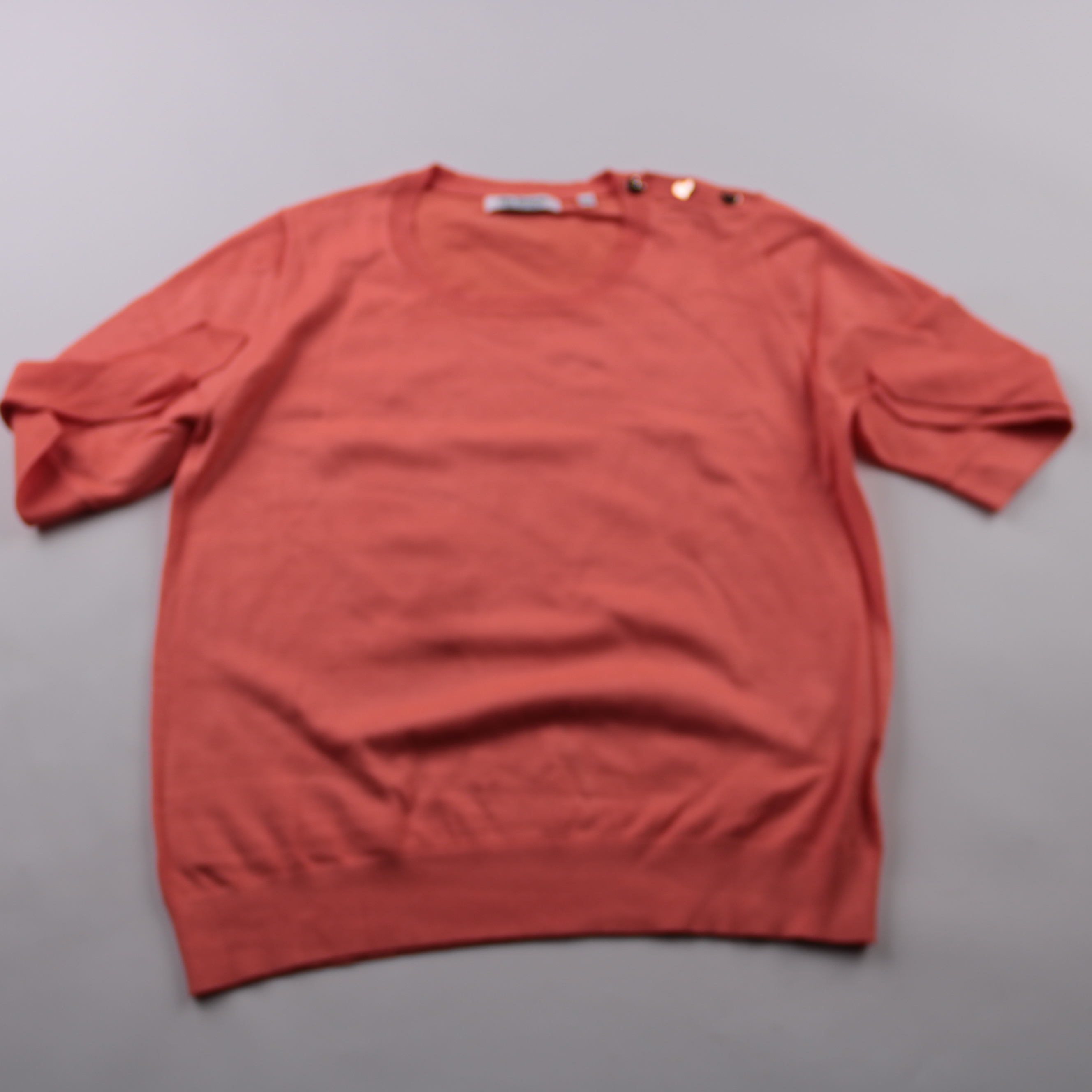 Футболка So Soire кораллового цвета с V-образным вырезом и декоративными пуговицами на плече. Подойдёт для повседневных образов и офиса в сочетании с брюками или юбкой. Ткань на основе вискозы приятная к телу и хорошо дышит.