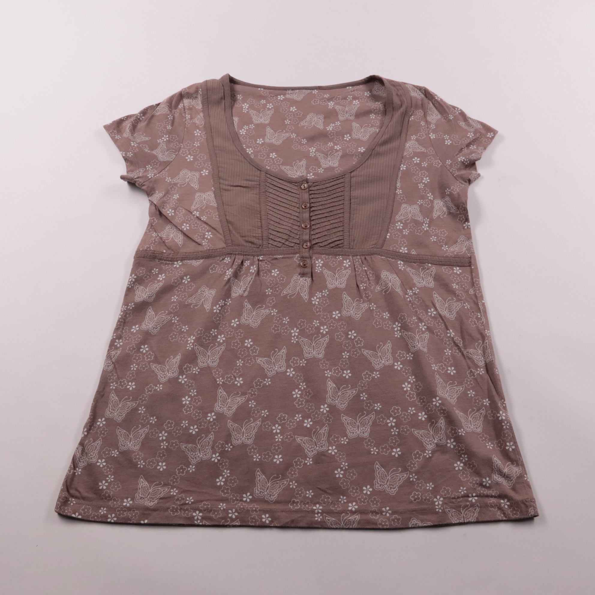 Футболка M&Co. в коричневом (cocoa) цвете с принтом бабочек и цветов, с коротким рукавом и планкой на пуговицах. Подойдёт для повседневных летних образов и поездок, благодаря мягкой ткани приятна к телу. Материал из хлопка и модала хорошо дышит и комфо...