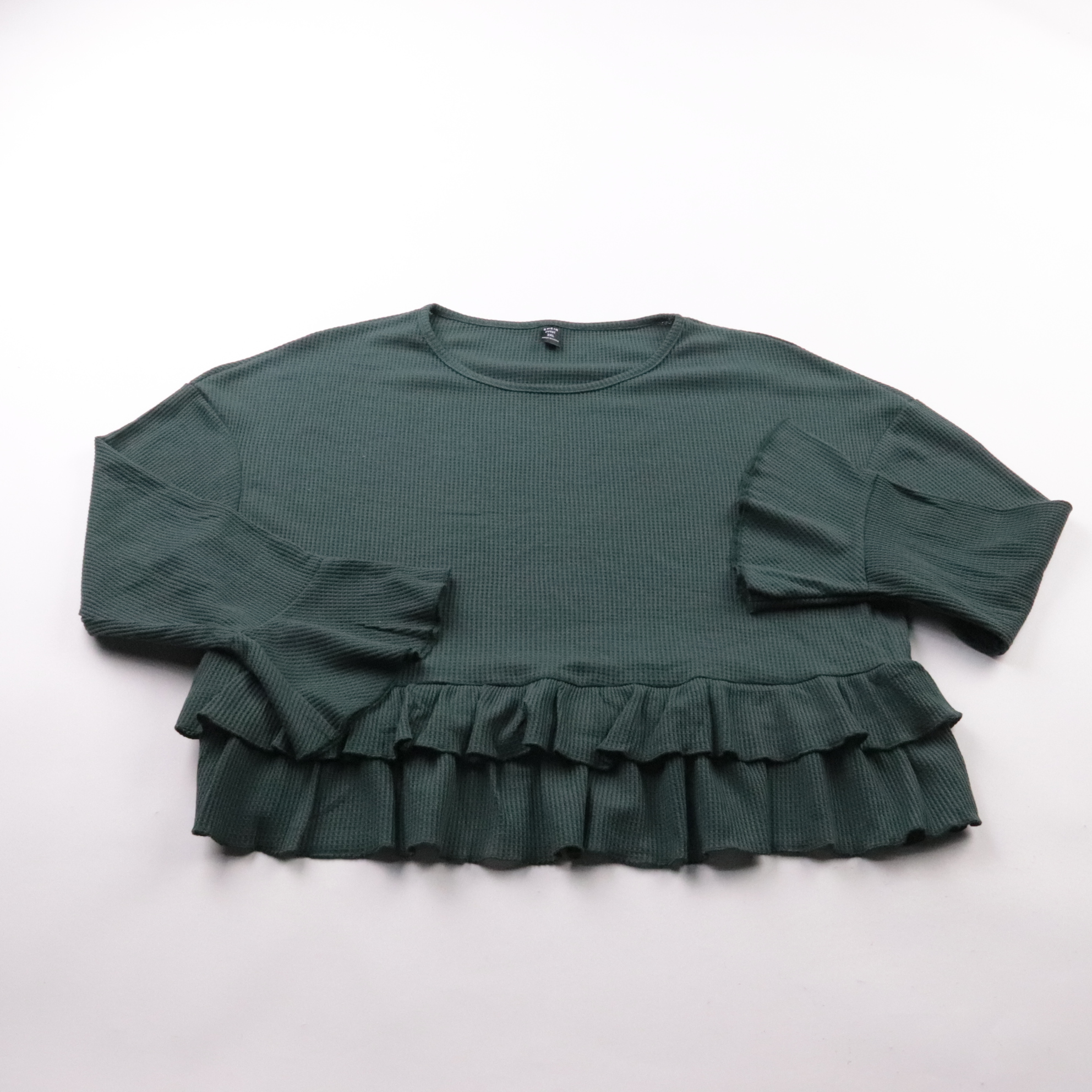 Лонгслив Shein Curve из фактурного трикотажа тёмно-зелёного цвета, с круглым вырезом и декоративными рюшами по низу. Подойдёт для повседневных образов с джинсами или юбкой в прохладную погоду. Материал тянется, поэтому комфортно садится по фигуре.