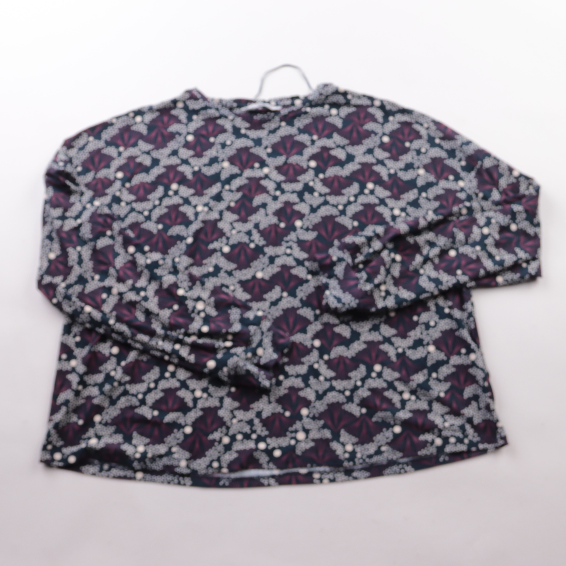 Женский лонгслив Primark с графичным принтом в тёмно-синих и бордовых тонах. Подойдёт для повседневных образов и как базовый слой под жакет или кардиган. Ткань эластичная, хорошо тянется и не стесняет движения.