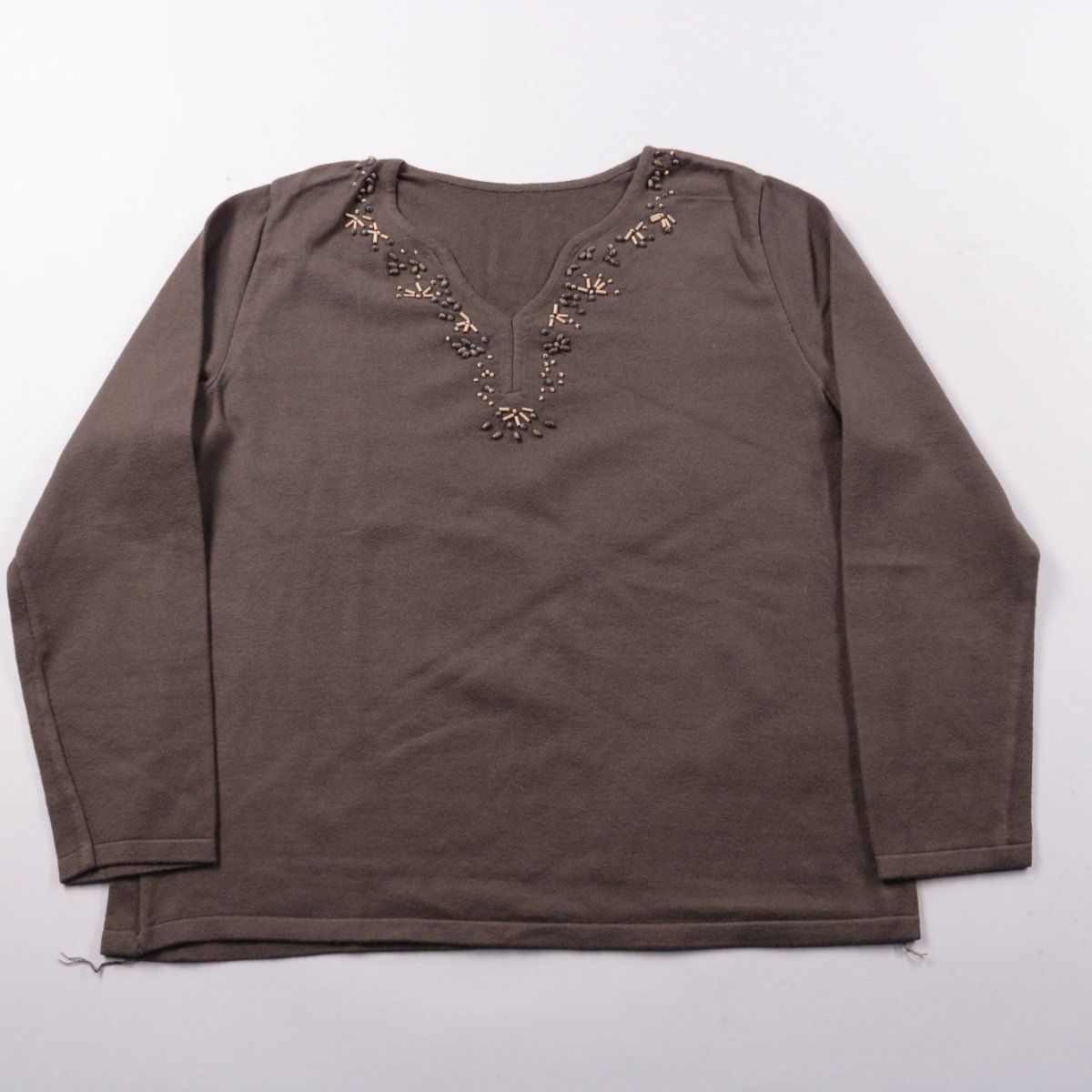 Женский лонгслив спокойного коричневого (тауп) цвета с V-образным вырезом и декором из бисера по горловине. Подойдёт для повседневных образов и офиса в сочетании с джинсами или юбкой. Практичный материал хорошо тянется и комфортно сидит по фигуре.