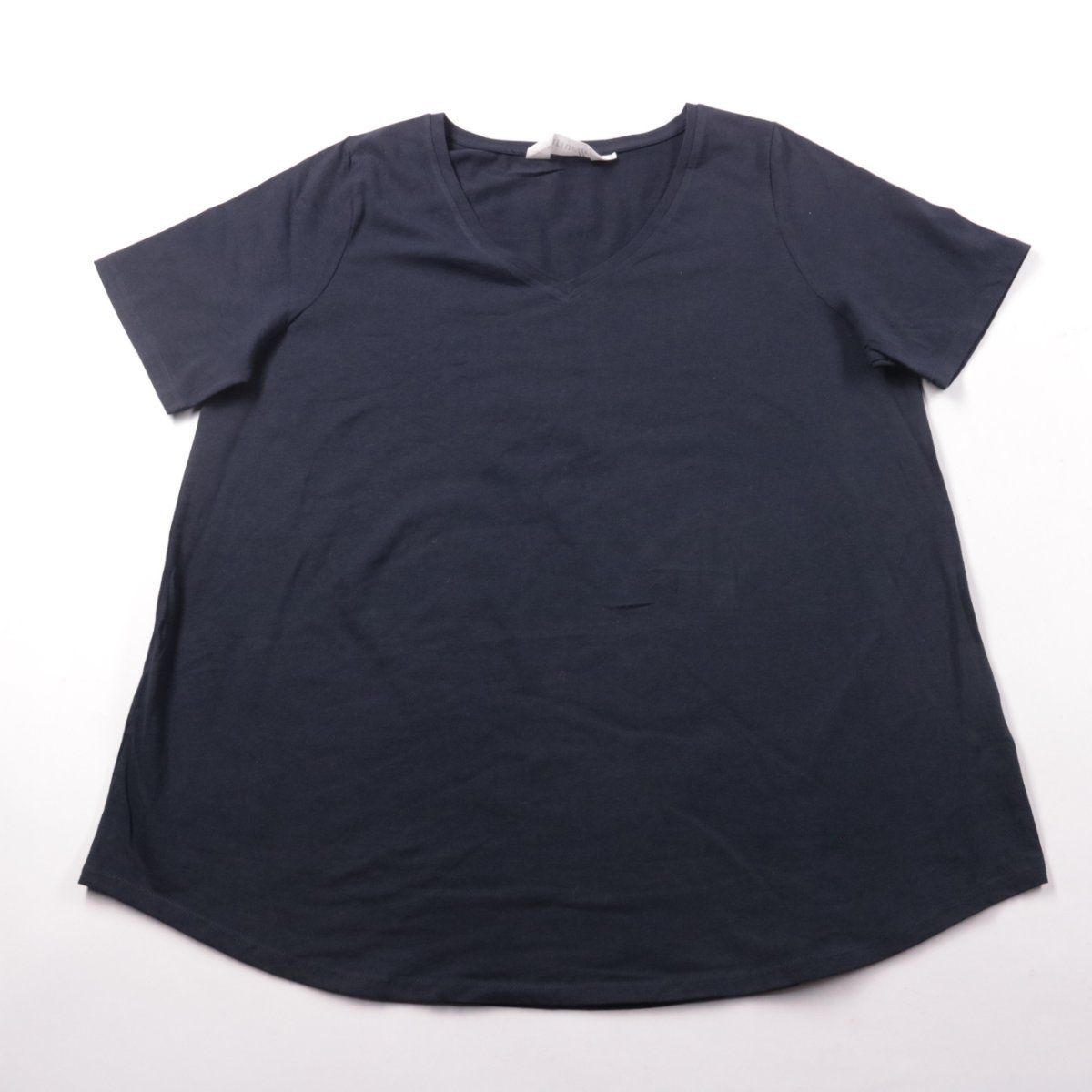 Женская футболка Virtuelle тёмно-синего цвета с V-образным вырезом и коротким рукавом. Подойдёт для повседневных образов и как базовый слой под жакет или кардиган. Хлопковая ткань с добавлением эластана комфортно тянется и держит форму.