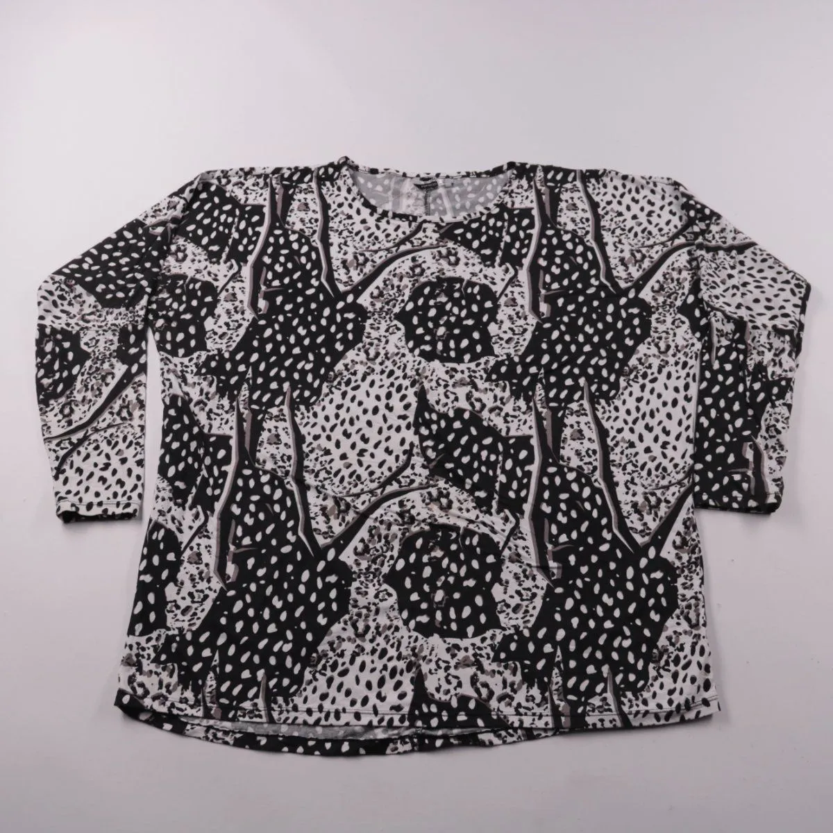 Женский лонгслив Pep&Co с черно-белым абстрактным принтом и круглым вырезом. Подойдёт для повседневной носки и офиса в сочетании с джинсами или юбкой. Трикотаж с эластаном немного тянется и комфортно садится по фигуре.