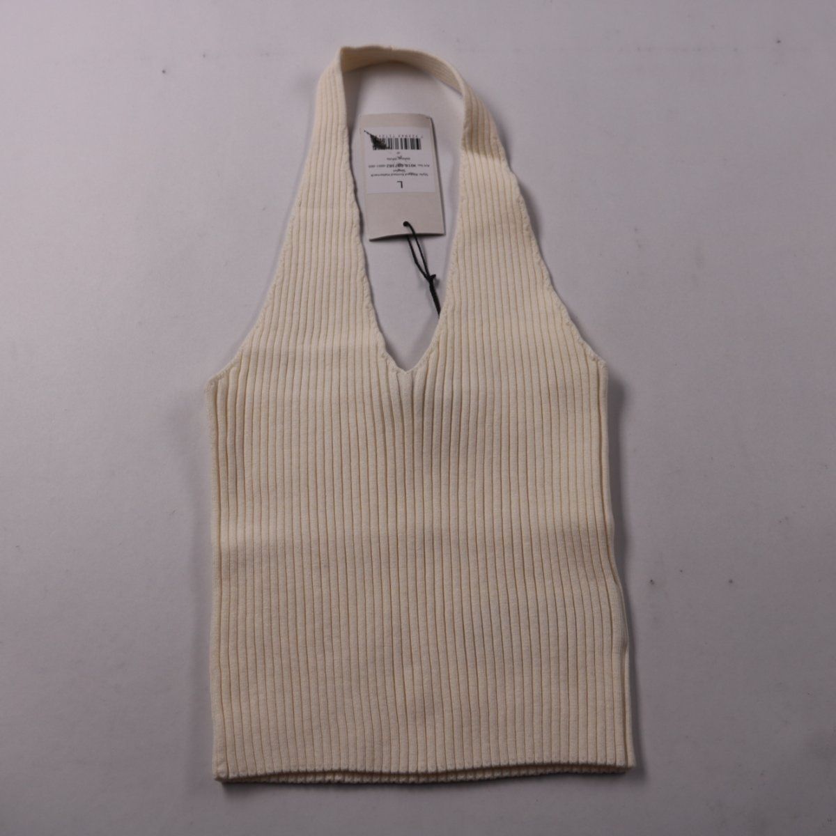 Женский трикотажный топ NA-KD в рубчик, молочно-бежевого цвета, с V-образным вырезом и халтер-горловиной. Подойдёт для летних образов и как базовый слой под жакет или рубашку. Эластичная вязка хорошо тянется и комфортно садится по фигуре.