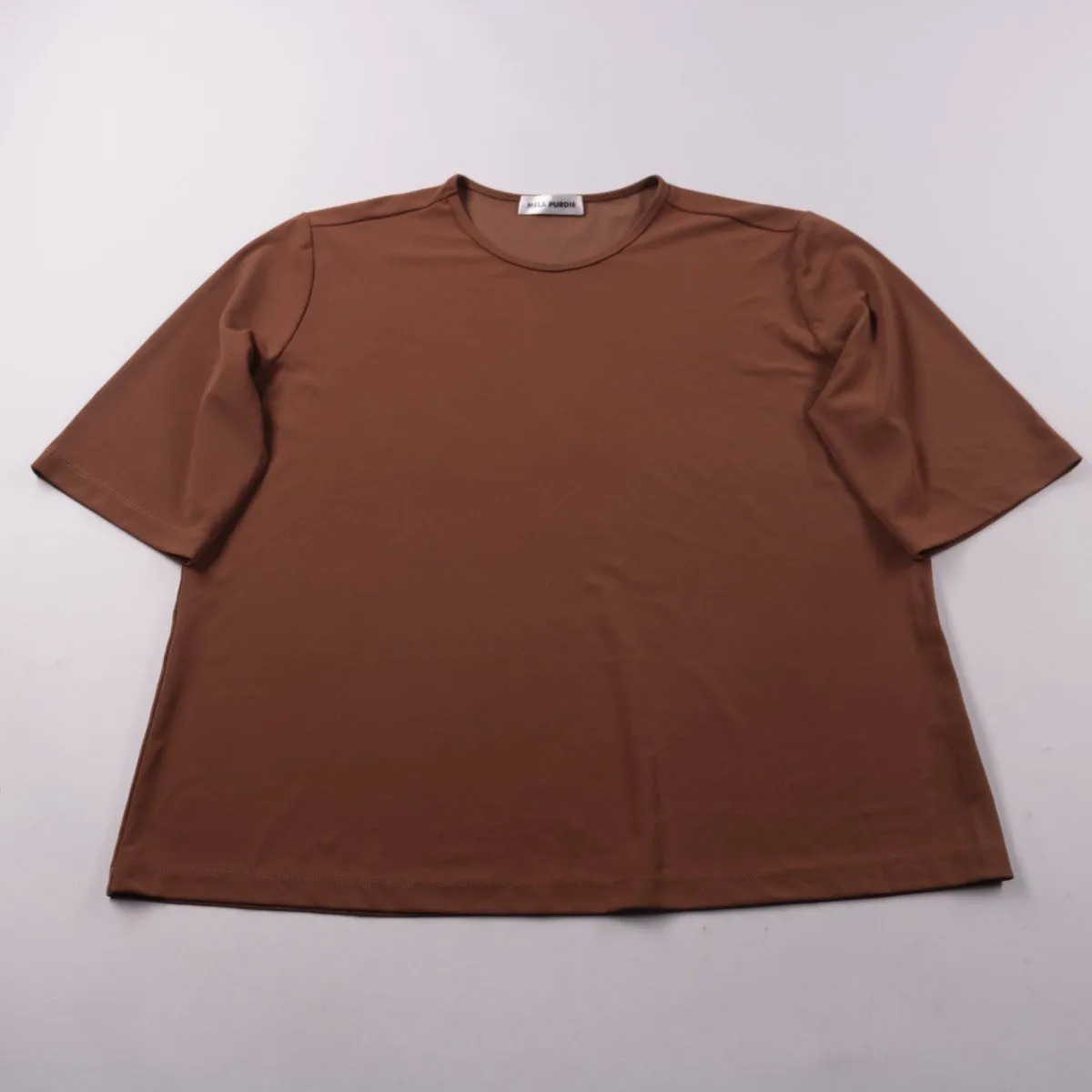 Футболка Mela Purdie коричневого цвета с круглым вырезом и коротким рукавом. Подойдёт для повседневных образов и базового гардероба, хорошо сочетается с джинсами и брюками. Ткань с добавлением спандекса тянется и комфортно садится по фигуре.