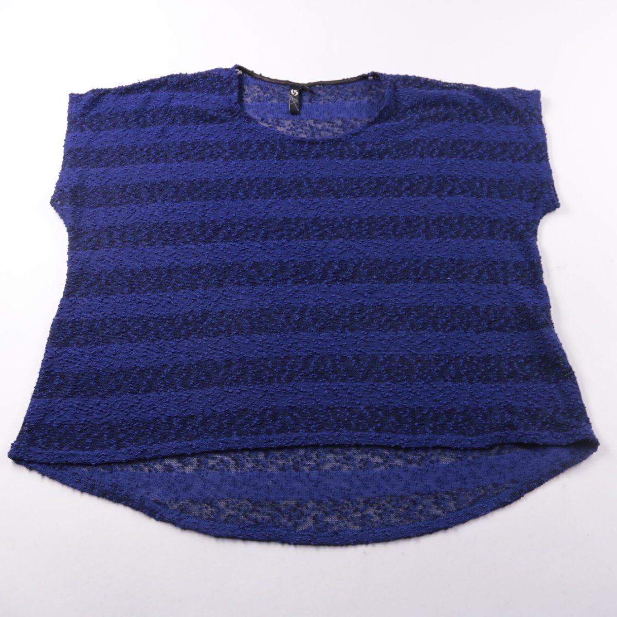 Футболка TS из фактурного трикотажа в синюю полоску, полупрозрачная за счёт рыхлой вязки. Подойдёт для лета и тёплой погоды, можно носить с топом или бра. Практична в уходе благодаря составу 100% полиэстер.