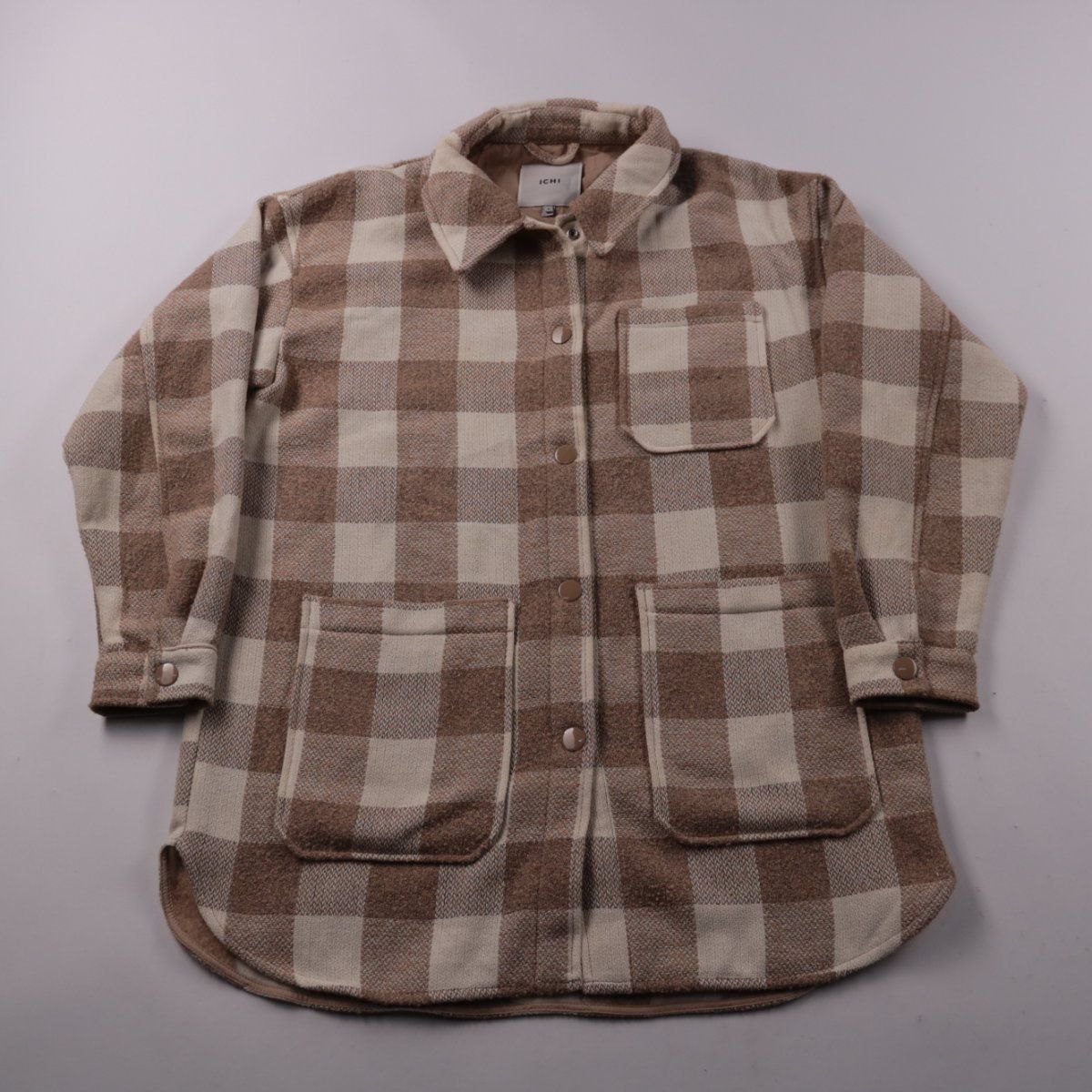 Лёгкая куртка-рубашка ICHI в бежево-коричневую клетку, застёгивается на кнопки и имеет накладные карманы. Подойдёт для демисезона и прохладных летних вечеров, удобно носить поверх футболки или водолазки. Практичный плюс — немаркий принт и плотная ткань, которая держит форму.