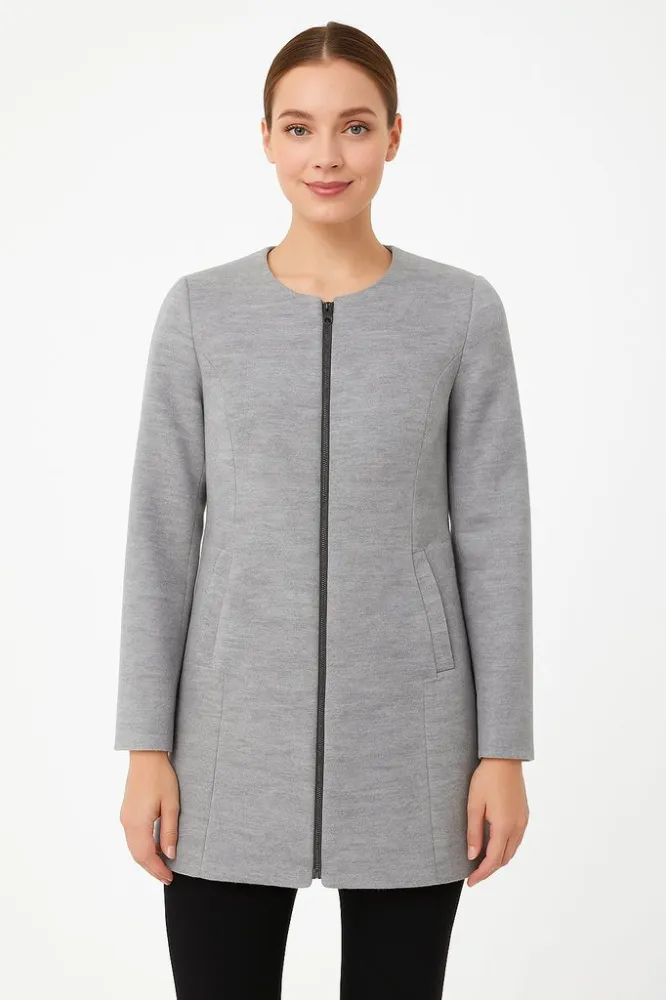 Женское демисезонное пальто Zarina из шерстяной смеси, прямого силуэта, на молнии и с боковыми карманами. Подойдёт для повседневных образов и офиса в прохладную погоду. Практичный серый цвет легко сочетается с базовым гардеробом.