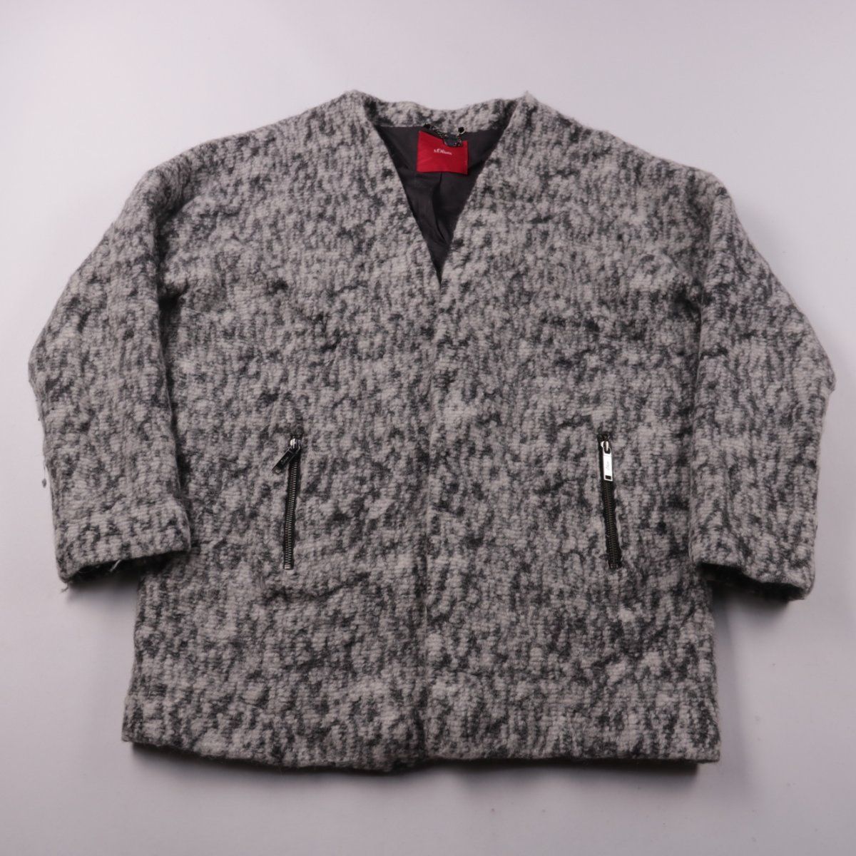 Женское пальто s.Oliver из фактурной ткани серого меланжа с V-образным вырезом и карманами на молнии. Подойдёт для прохладной погоды весной и осенью, удобно носить поверх свитера. Практичное за счёт плотного материала и подкладки.