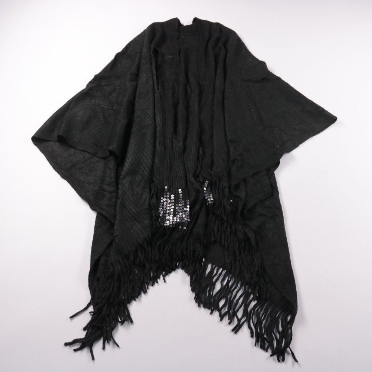 Чёрный шарф с бахромой и декоративными пайетками. Подойдёт для демисезонных образов и вечерних выходов, можно носить как шарф или накидку на плечи. Лёгкий и компактный, удобно брать с собой.