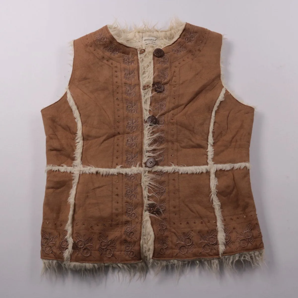 Женский жилет Atmosphere из мягкого материала под замшу с тёплой меховой отделкой и декоративной вышивкой. Подойдёт для прохладной осени/весны и уютных повседневных образов, хорошо смотрится поверх водолазки или свитера. Застёгивается на пуговицы и добавляет дополнительное утепление без лишнего объёма в рукавах.