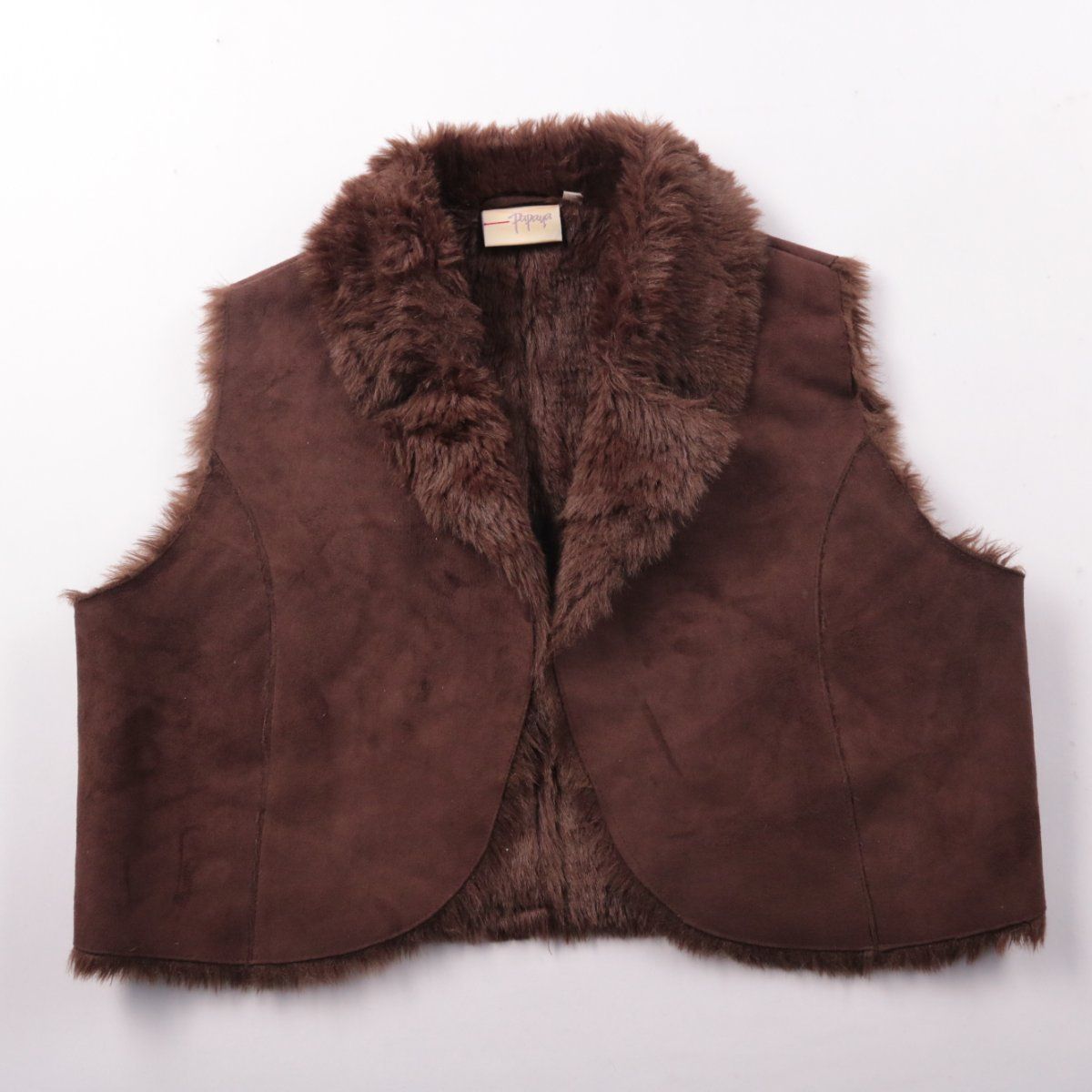 Женский жилет Papaya из искусственного меха в тёмно-коричневом цвете, без рукавов и с объёмным меховым воротником. Подойдёт для прохладной погоды и многослойных образов с водолазкой или свитером. Практичный плюс — лёгкий уход: можно стирать на деликатном режиме.