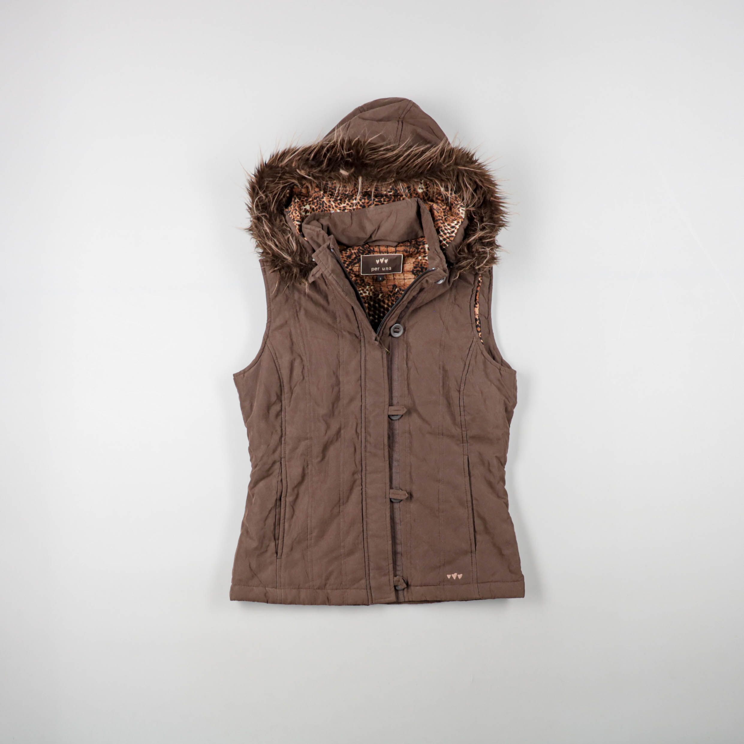 Утеплённый жилет Per Una коричневого цвета с капюшоном и опушкой из искусственного меха, внутри подкладка с леопардовым принтом. Подойдёт для прохладной осени и весны поверх свитера или худи. Практичны карманы и высокая застёжка, которая защищает от ве...