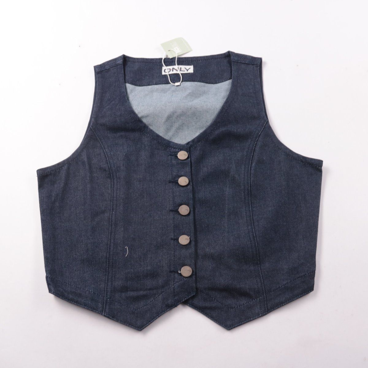 Джинсовый жилет Only в тёмно-синем цвете, застёгивается на пуговицы и хорошо держит форму за счёт вытачек. Подойдёт для повседневных образов поверх футболки, рубашки или платья в тёплый сезон и в помещении круглый год. Практичный материал с добавлением эластана комфортно садится по фигуре.