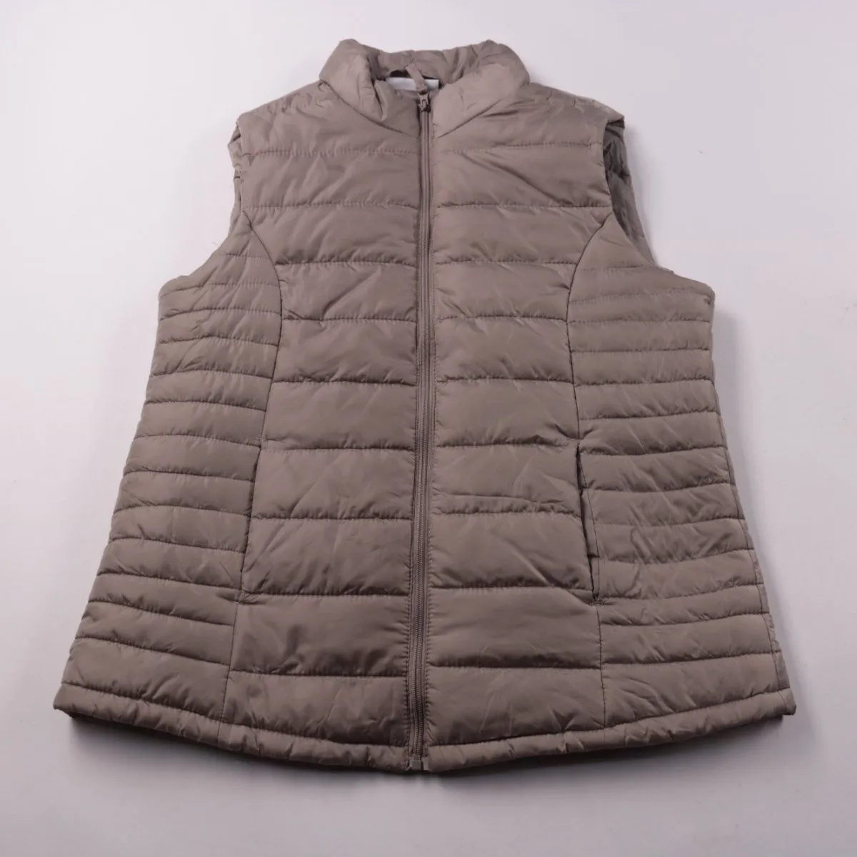 Стёганый утеплённый жилет Janina бежево-серо-го (тауп) оттенка, застёгивается на молнию и с высоким воротником. Подойдёт для прогулок и поездок в межсезонье, удобно носить поверх худи или свитера. Лёгкий и практичный в уходе за счёт полиэстера.