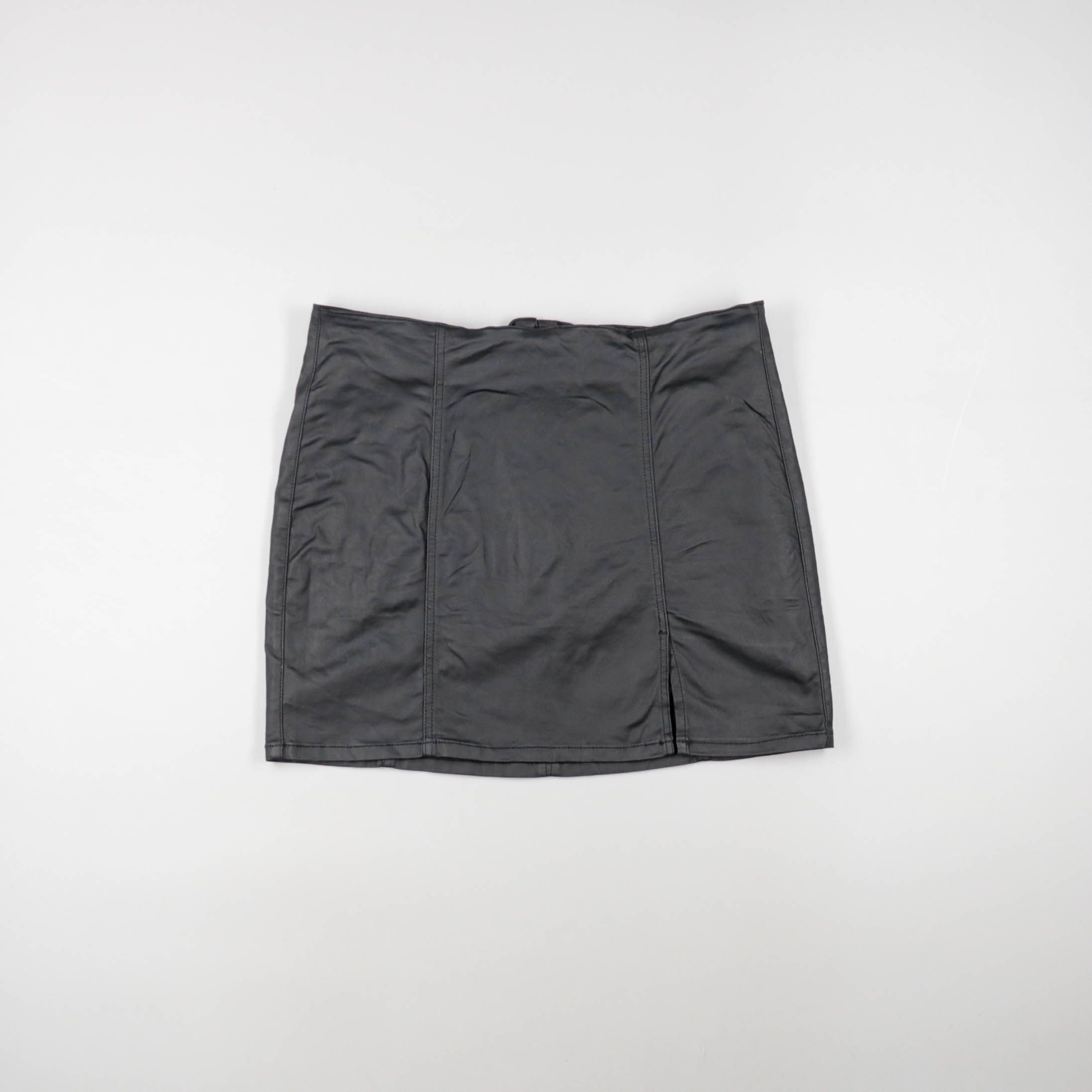 Чёрная юбка мини из материала под кожу с вертикальными швами и разрезом сбоку. Подойдёт для повседневных образов и вечерних выходов, легко сочетается с футболками и рубашками. Практичное преимущество — плотная ткань держит форму и быстро протирается вл...