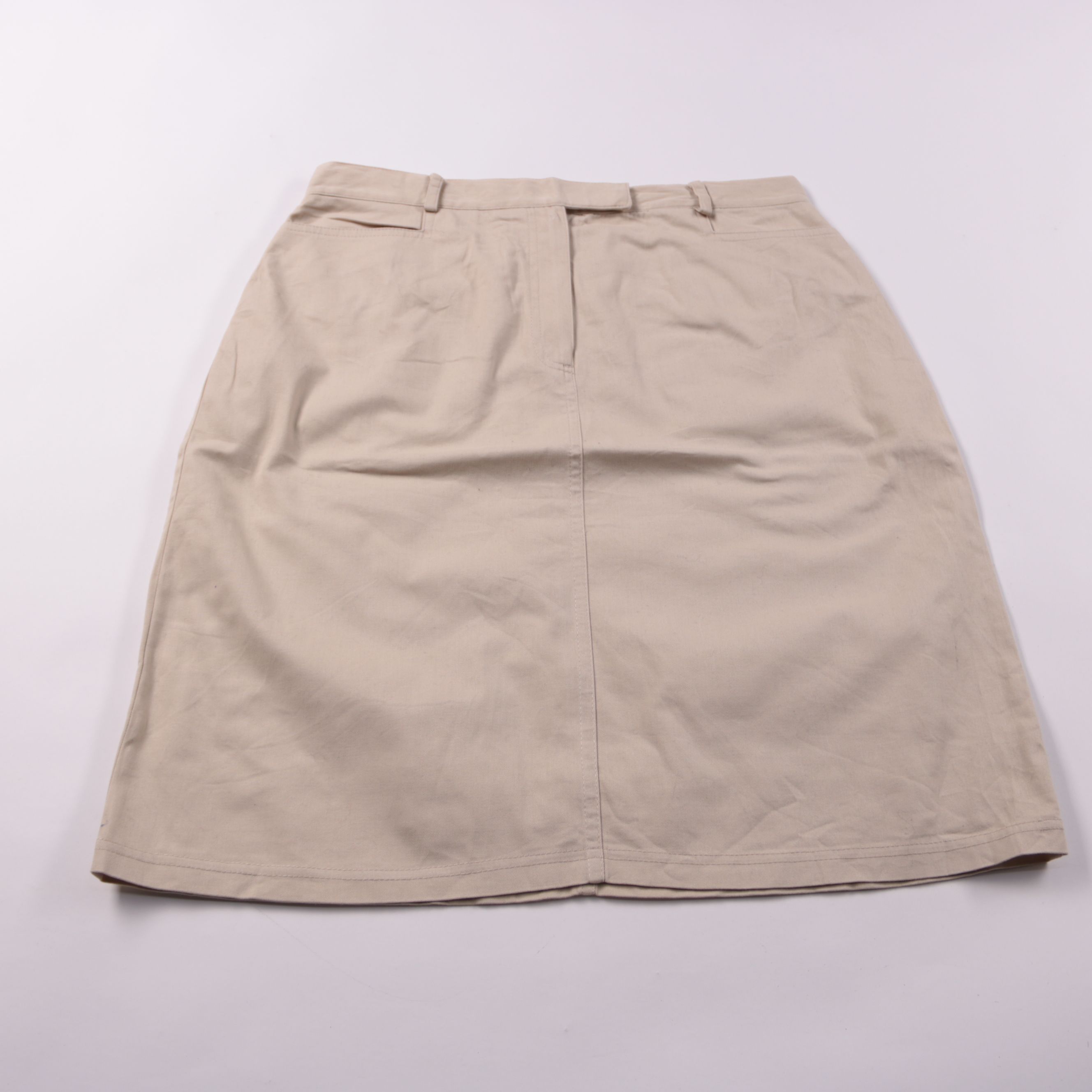 Бежевая юбка прямого кроя с поясом и шлёвками. Подойдёт для офиса и повседневных образов с рубашкой или футболкой. Практичный светлый базовый цвет легко сочетается с любыми оттенками.
