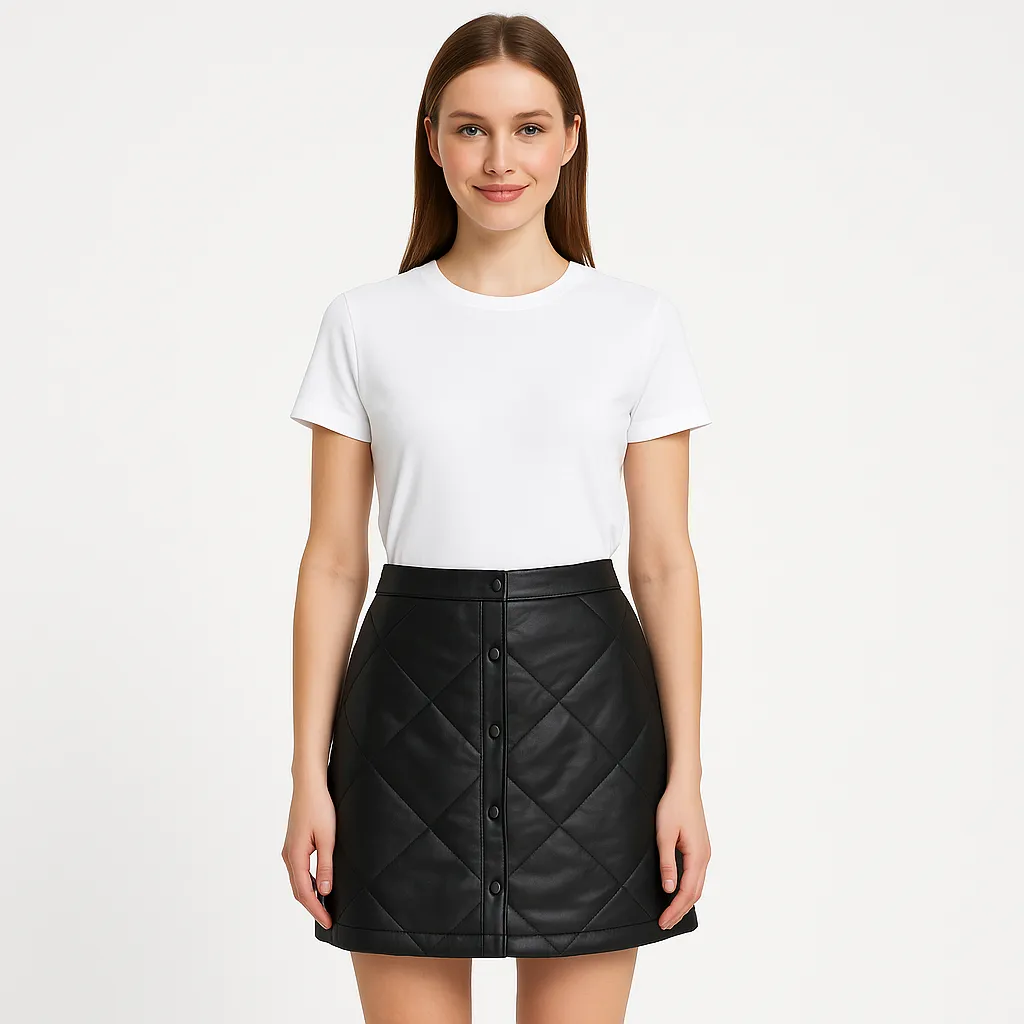 Юбка JJXX из искусственной кожи с ромбовидной стёжкой и застёжкой на кнопки спереди. Подойдёт для повседневных образов и выхода в город, легко сочетается с базовыми футболками и свитерами. Практичный материал прост в уходе и хорошо держит форму.