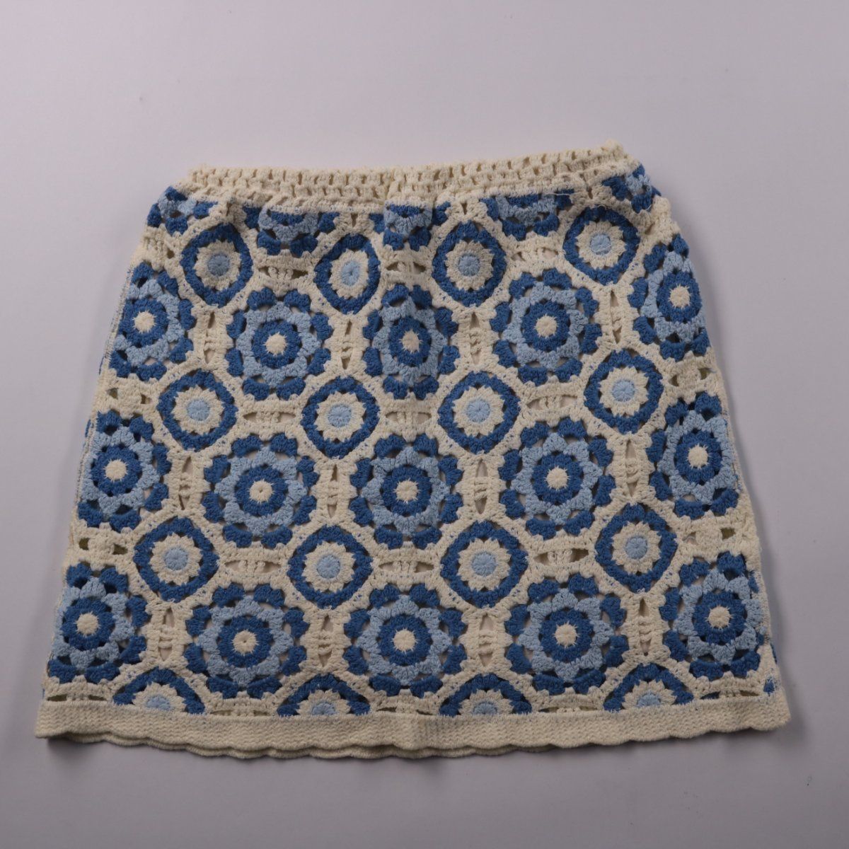 Вязаная юбка Musy Muse с ажурным узором в сине-белых тонах. Подойдёт для летних образов и отдыха, хорошо смотрится с однотонным верхом. Хлопковая основа приятна к телу и дышит.