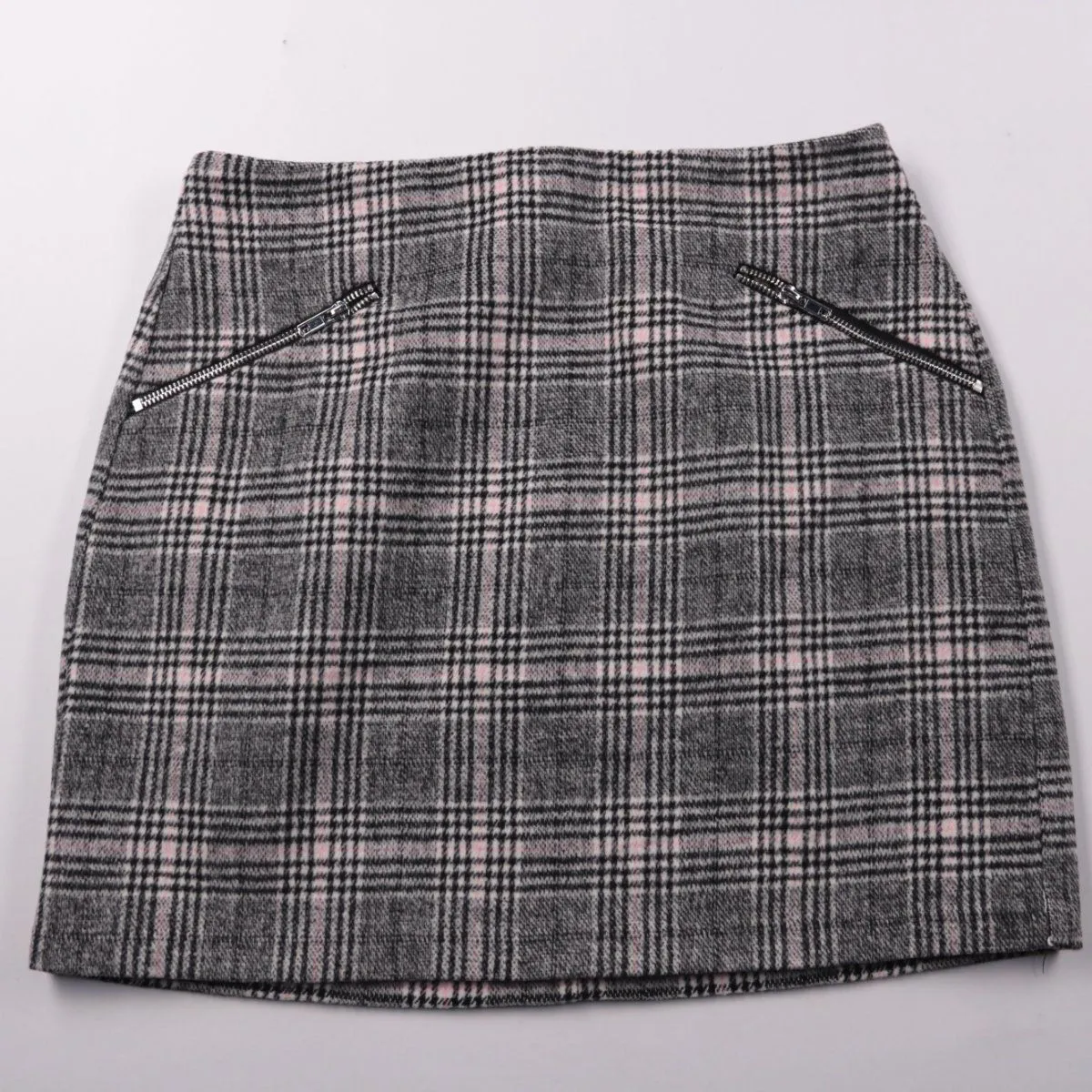 Юбка New Look прямого кроя в серую клетку с декоративными молниями по бокам. Подойдёт для повседневных и офисных образов в прохладную погоду. Плотная ткань держит форму и легко сочетается с базовыми вещами.