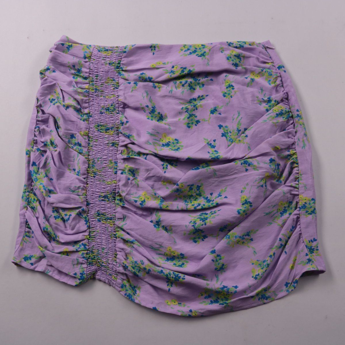 Мини-юбка Vero Moda с цветочным принтом на лиловом фоне и декоративной сборкой сбоку. Подойдёт для летних прогулок и отпускных образов с топами и сандалиями. За счёт мягкой вискозы и присборенных деталей комфортно садится и не сковывает движения.