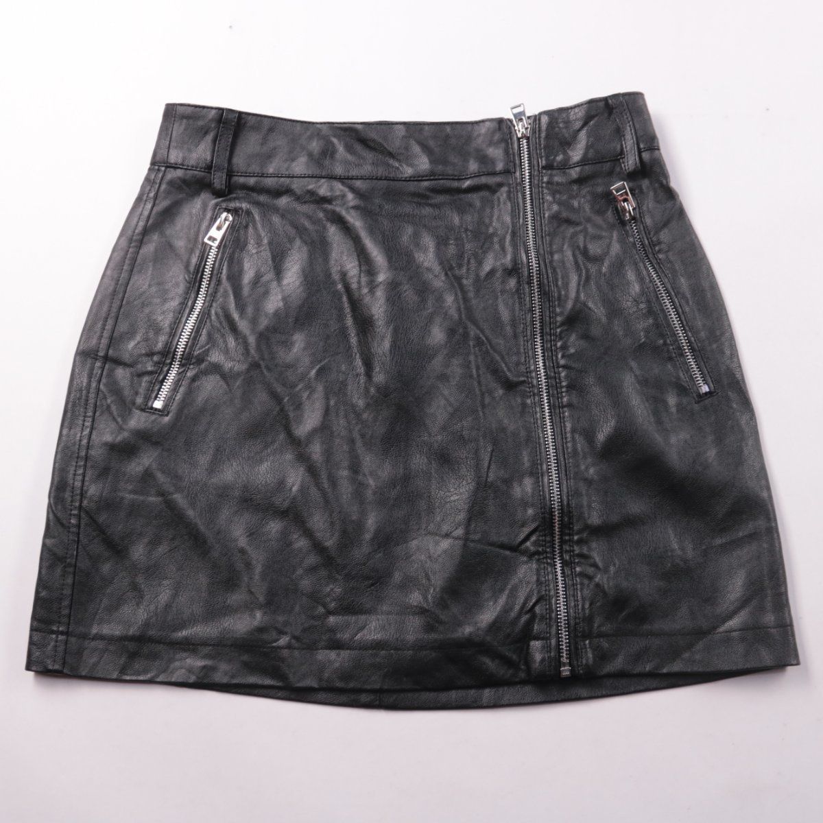 Юбка Topshop из черной экокожи, длина мини, с центральной молнией и карманами на молниях. Подойдёт для повседневных и вечерних образов в прохладную погоду. Практичный плюс — легко сочетать с базовыми вещами и удобно застёгивается спереди.